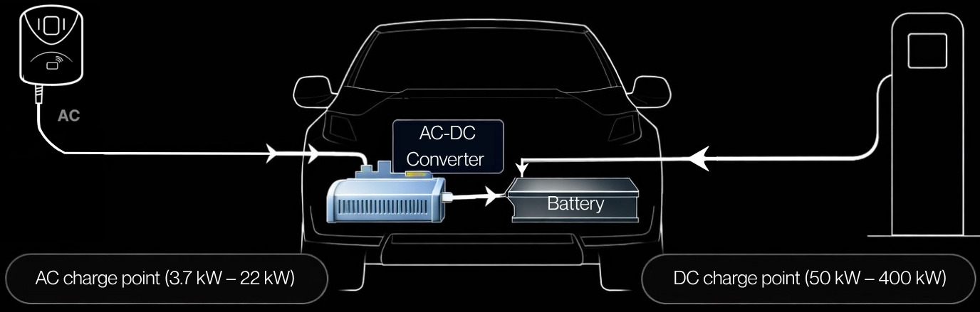 Charging an electric car means transferring energy from the power grid to the vehicle battery. The key point is that the grid supplies alternating current (AC), but batteries can only store direct current (DC).