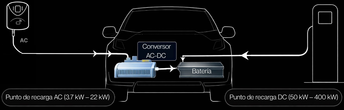 Cargar un coche eléctrico es transferir energía desde la red eléctrica hasta la batería del vehículo. El punto clave es que la red suministra energía en corriente alterna (AC), pero las baterías solo pueden almacenarla en corriente continua (DC).